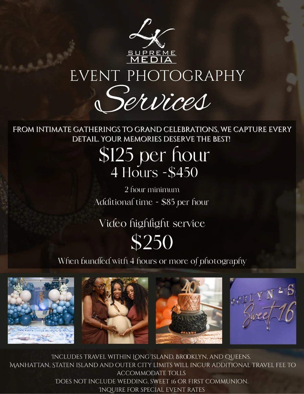 *rates are based on a two hour minimum. Bundle discounts available for Portrait and Event photography packages. Inquire for more details!